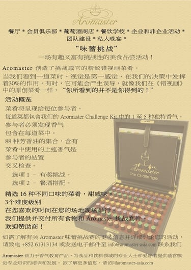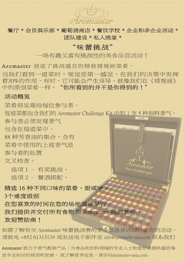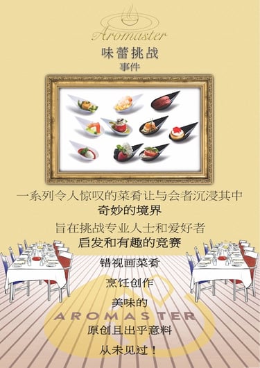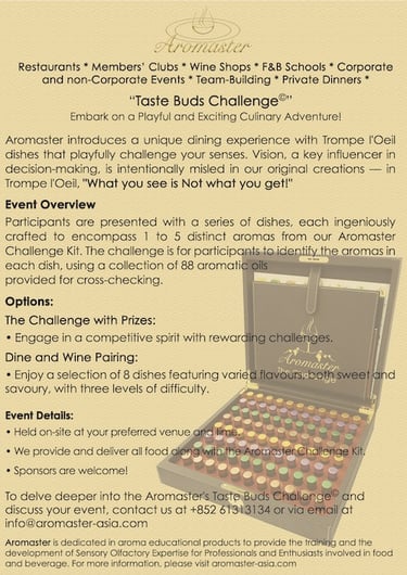 Aromaster introduces a unique gaming experience with Trompe l'Oeil dishes that playfully challenge your senses. Vision, a key influencer in decision-making, is intentionally misled in our original creations - in Trompe l'Oeil, "What you see is NOT what you get!"
